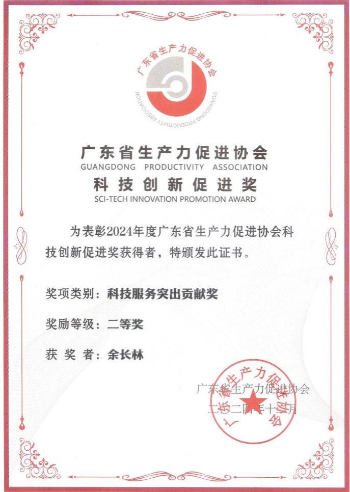 近日,2024年度广东省生产力促进协会科技创新促进奖颁奖仪式在广州举行。我校化学工程学院余长林教授荣获2024年度广东省生产力促进科技服务突出贡献奖二等奖。广东省生产力促进协会科技创新促进奖设置生产力促进奖和科技服务突出贡献奖两个奖项,由广东省科学技术评审委员会办公室备案。科技服务突出贡献奖旨在表彰在生产、应用研究工作对核心技术、关键技术创新与集成具有突出贡献,在科学研究中取得重要科技成果的科技工作者。2024年度科技服务突出贡献奖共设置一等奖10项,二等奖38项。