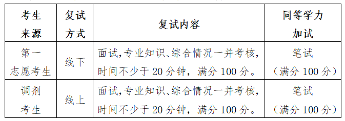1. 复试方式:第一志愿考生采用线下现场复试,以综合面试形式进行;调剂考生采用网络远程进行线上复试。同等学力考生加试时间另行通知。