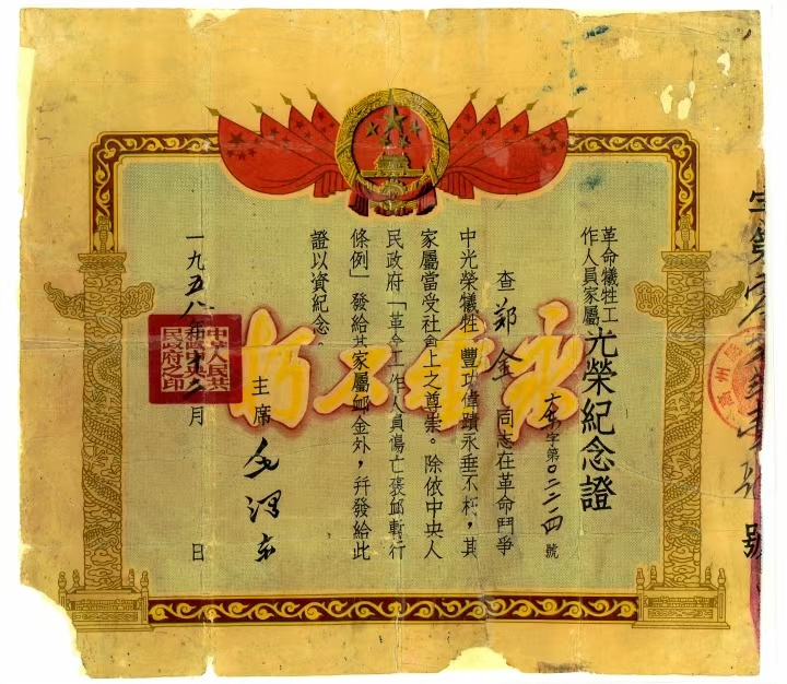毛主席为郑金烈士颁发的烈士证